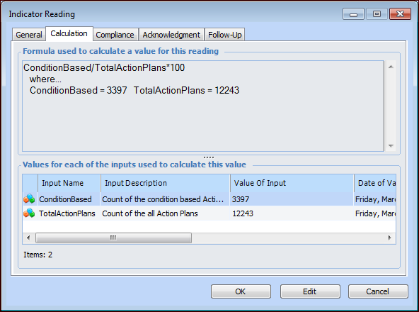 • To see the input values for the most recently collected value, select the Readings tab and double-click a reading to open the Indicator Reading dialog. Select the Calculation tab, which lists the values for each calculation input in the calculation. For example: