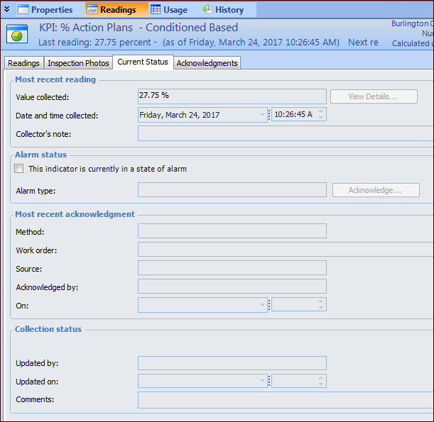 • Select the Readings view and then the Current Status tab. This tab lists the most recent value collected for the indicator and its current alarm and acknowledgment status. For example: