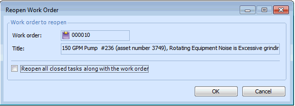 Alternatively, you can reopen only a single work order task. To reopen a single task, see Reopening a Work Order Task.To Reopen a Work Order