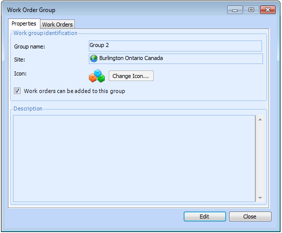 5. Click Work orders can be added to this group to clear the option. The group is now closed and no other work orders can be added. Click OK.