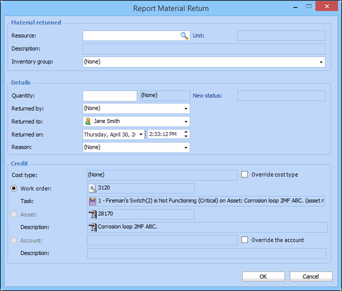 • If crediting to a Work order, click Browse. Select the work order in the selector dialog and click OK. You can select a task on the work order using the Task list.