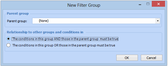 1. Open the configuration dialog, select the Filtering tab, and click New Group. The New Filter Group dialog appears.Tip: You can also right-click the parent group in the Filtering tab hierarchy and click New Group. The New Filter Group dialog appears with the parent group selected.