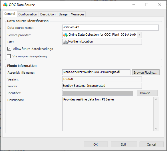 7. Select Ivara ODC Plugin for PI and click OK. On the ODC Data Source dialog, the Plugin information area is populated.