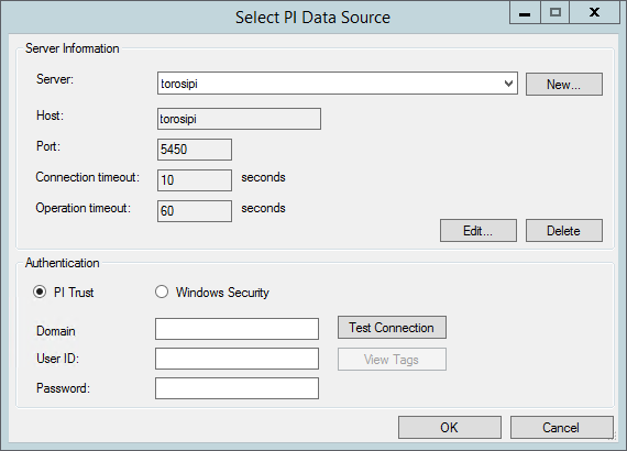 10. Click Browse to open the Select PI Data Source dialog. Select the PI server path from the list. For example: