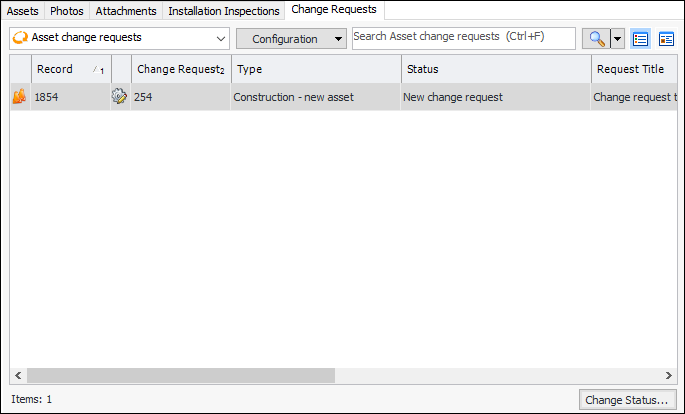 5. You can change the request’s status by selecting it in the table and clicking Change Status. The Change Asset Change Request Status dialog appears, where you can select a different status, enter comments, and click OK.Tip: On the Construction Management and Assets views, the Change Requests tab lists the change requests that have been created for the site. Double-click a request to open it.