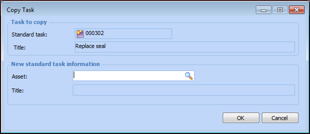 4. Click OK. APM creates a standard task with the same information as the original, except for the asset that you selected. If the original standard task was based on a task template, the copy is also linked to that template.