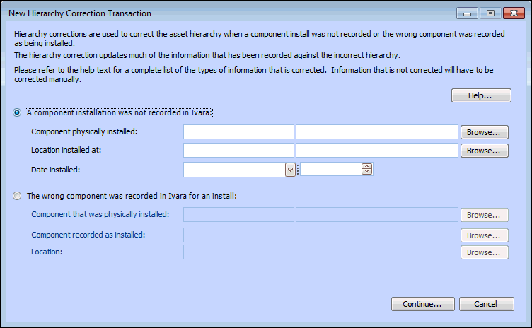 • From an asset, click the Tools menu, New, and then Hierarchy Correction. The New Hierarchy Correction Transaction dialog appears.