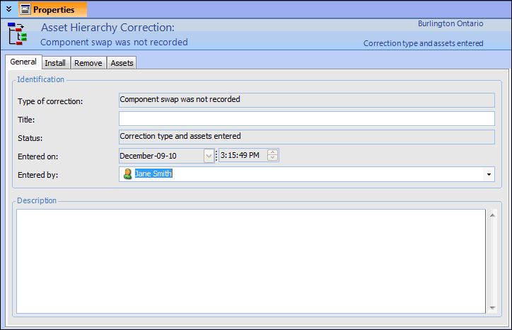 2. Select the problem you are correcting: A component installation was not recorded in APM or The wrong component was recorded in APM for an install. When a component installation is not recorded, a component was physically removed and its replacement was installed but the swap was not recorded in APM. As a result, data collected and activities performed against the installed component continue to be recorded against the component that was previously installed.