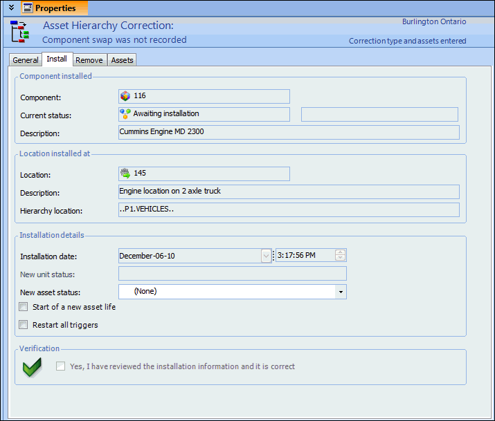 6. Select the Install tab and enter the installation details. You should enter the same asset status, asset life, and triggering information that were entered on the original component swap.