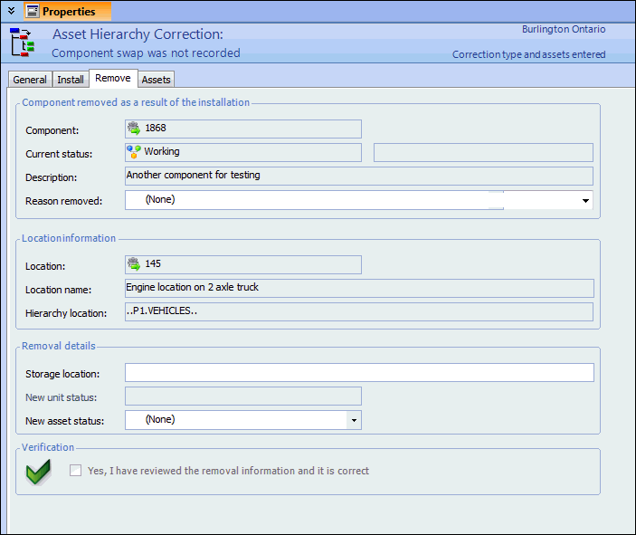 8. Select the Remove tab to enter the removal details. Again, enter the same reason and asset status that were entered on the original component swap.