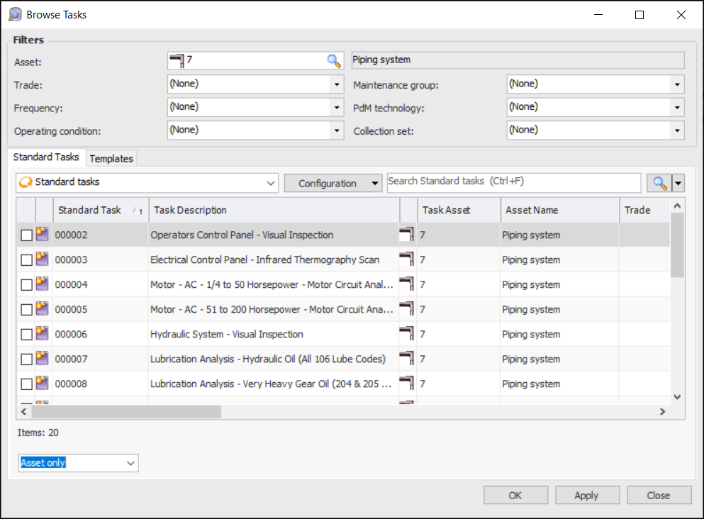 5. Select the standard tasks or task templates that you want to add to the work order and click OK. APM adds the tasks to the work order.To Add Tasks from Standard Jobs or Job Templates