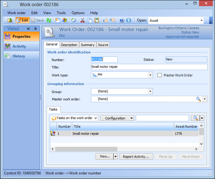 3. On the Properties view, select the General tab. This tab shows a list of all tasks currently on the work order.