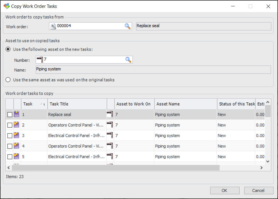 • To use the asset already listed on the tasks you are copying, select Use the same asset as was used on the original tasks.