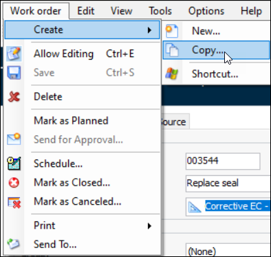 2. From the Work Order menu, select Create, and then Copy. In the confirmation message that appears, click Yes.APM opens a new work order with the same information and tasks as the original work order, but with a new work order number. APM will not copy historical information from the original work order, such as actual costs and transactions, request information, standard job triggering information, or alarm acknowledgment information.