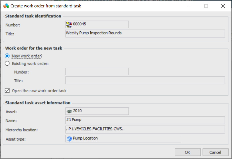 6. Click OK. APM creates a new work order or adds a task to the selected work order. If you selected to open the work order task, the work order task window appears.