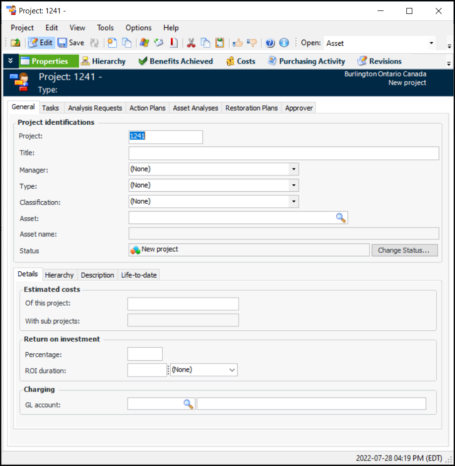 4. Optionally, you can browse to select an asset to assign to the project. The Asset and Asset name boxes are populated with the asset information. The asset information provides a reference that makes it easier to search for projects.