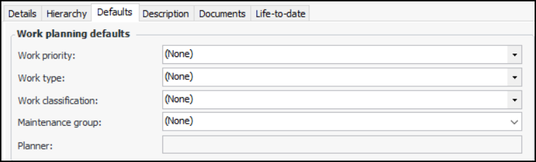 9. If the project type allows planning defaults to be defined, select the Defaults tab and select the default values for work order tasks for the project.