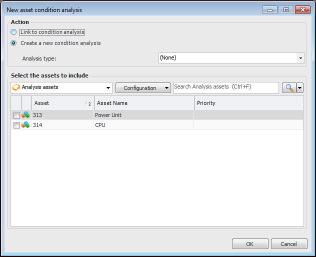 • Create a new condition analysis – Select an analysis type and one or more secondary analysis assets, if required. The condition analysis’ primary asset will be the same as the prioritization analysis’.