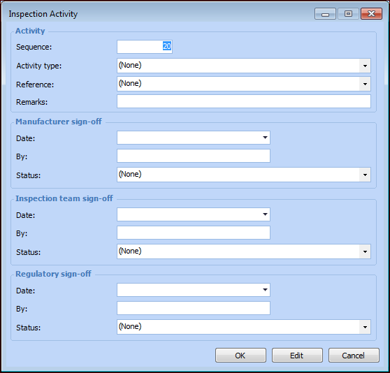 3. If you need more than one activity of the same type, click the New list and then New. The Inspection Activity dialog appears: