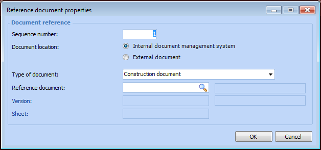 • For internal documents, click the browse icon () to open the Standard Document Selector dialog. Select the document and click OK. Provide the version and sheet numbers.