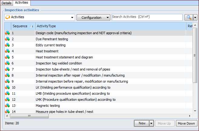 1. In the Checksheet window, Modification Inspection view, select the Activities tab. This tab lists the activities provided by the checksheet type. For example: