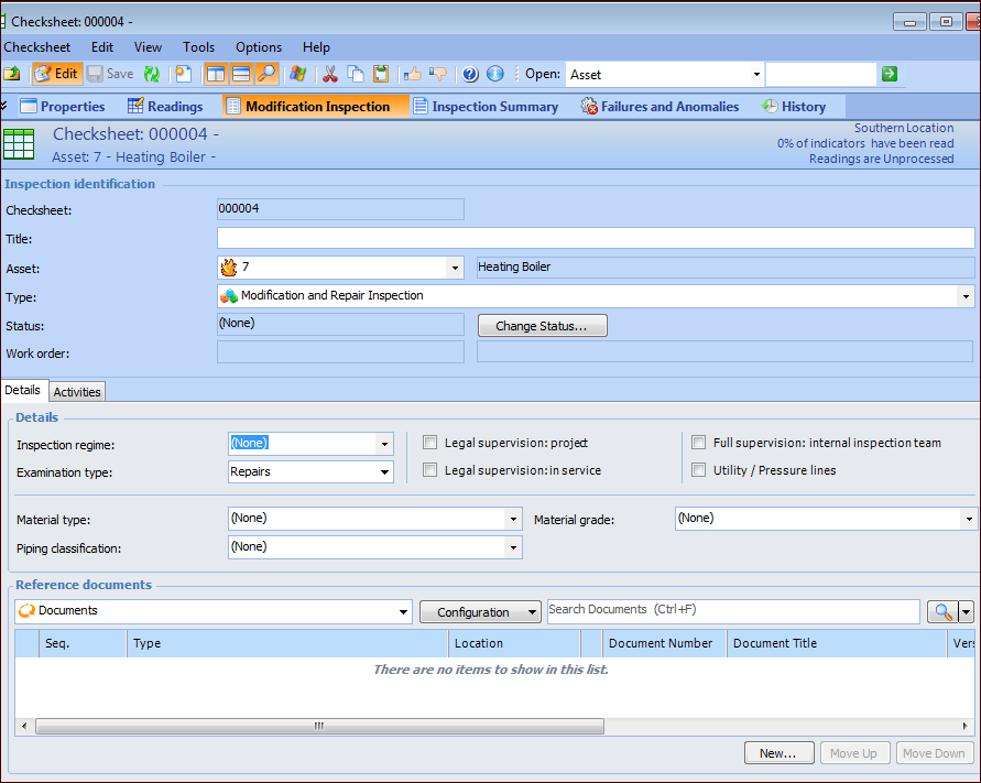 5. If you created the checksheet from the site, the Asset box becomes available. You can browse for an asset, if needed.Tip: Alternatively, you can select Include modification and repair inspection in the Checksheet window’s Properties view. This adds the Modification Inspection view to the window. Select this view and the Activities tab to browse for activity types to add to the checksheet.