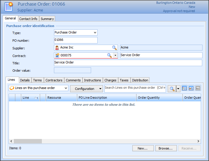 8. Complete the information on the Instructions, Taxes, Charges, and Distribution tabs as with any purchase order line.