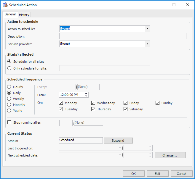 6. Define the Scheduling frequency for the action. See “Defining Recurrence Patterns”, below.)