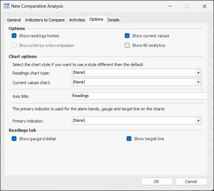 By default, a gauge sidebar is displayed in the Analysis view, Indicators tab, Readings tab. You can turn this feature off by clearing the selection.