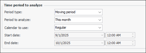 • Moving period: Select this option to set a time period that is relative to the current date. For example, if you are setting a time period for a comparative analysis, you could create an analysis for readings collected in the last month. If you select this option, each time you open the analysis or dashboard, you might see a different set of readings depending on the current date and the period that was selected to analyze.