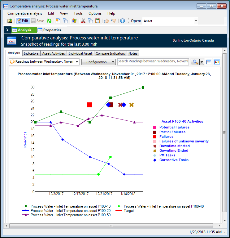 14. Select the Analysis view, Indicators tab to view readings and current values for the analysis (Current values on the Properties view, Options tab must be selected).