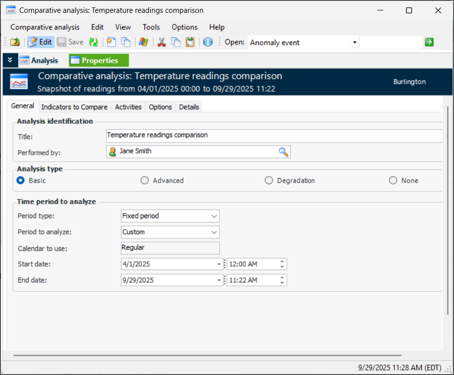 12. To create the analysis, click OK. The Comparative Analysis window appears. Select the Properties view, General tab to review settings. For example: