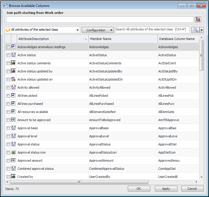 4. In the Browse list click Browse available columns to choose the columns you want to include in the configuration. The Browse Available Columns dialog appears. For example: