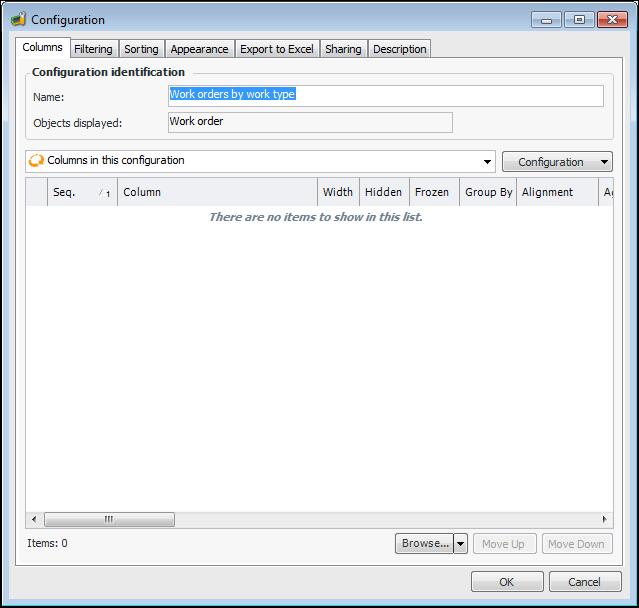 A table configuration controls what information is listed in a table and how it is displayed. A table configuration is a combination of columns, filtering criteria, sorting criteria, and format choices that display specific data, such as all RCM2 analyses with a status of “New”.You can create a table configuration from scratch, as described here, or create it by copying an existing configuration and making changes. For more information, see Copying Table Configurations.To Open and Name a New Table Configuration