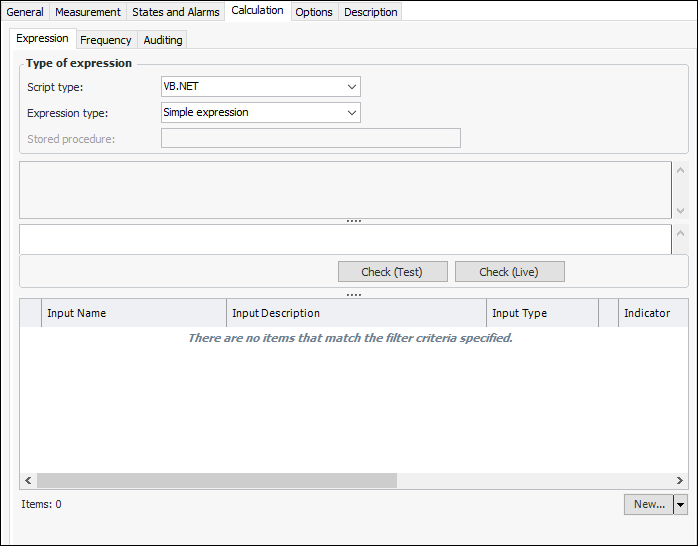 24. When you have defined the calculation expression and inputs, you can click Check (Live). The test function uses the values from the inputs (for example, indicator readings) and displays the result in the Test Reading window.