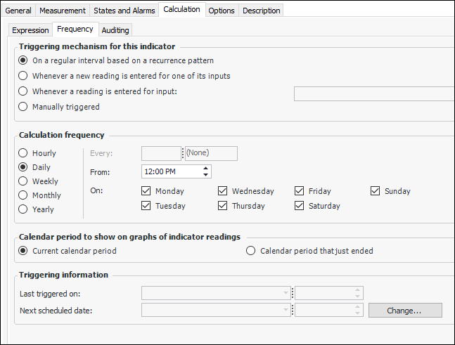 28. In the Triggering mechanism section, select when and how the system will trigger the calculation. If the calculation will be triggered at a regular interval (based on a recurrence pattern), define the scheduled interval for the indicator.