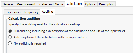29. Select the Auditing tab. To improve product performance, you can control the amount of audit information generated when a reading is created. (The audit information is displayed in the Indicator Reading window, Calculation tab.)