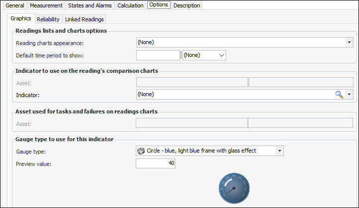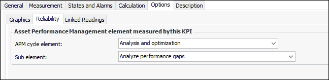 32. If the performance indicator records information related to a stage in the Asset Performance Management cycle (for example, strategy development), select the Options tab and then the Reliability tab.