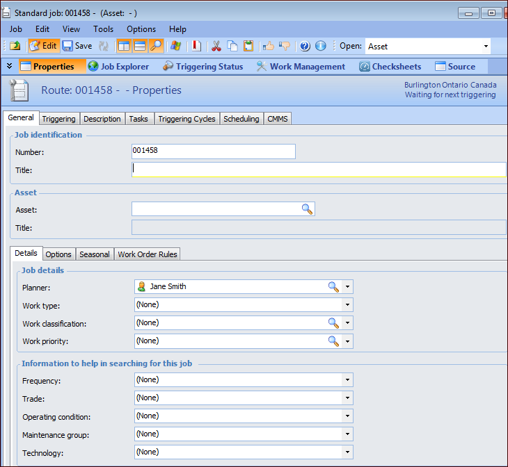 1. From the site, select the Tools menu, New, Reliability Program, and then PM Route. The Standard job window appears, open to the General tab.