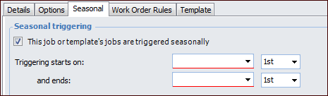 Concepts Tasks Settings Creating a Seasonal Standard Job You can set a range of dates for triggering the work order from a standard job. For example, you might have jobs that are only performed at a specific time of the year. When setting up a seasonal job, work orders are only created during the months specified on the job. To Set up a Seasonal Standard Job 1. Open the standard job or job template. 2. Make sure that editing is enabled. 3. On the Properties view, select the General tab and then the Seasonal tab. 4. Select This job or template’s jobs are triggered seasonally. 5. Select the starting month and day. 6. Select the ending month and day. 7. When you are finished, save and close the job.