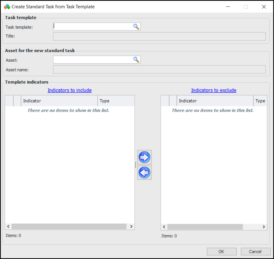 4. Select a task template and click OK. The task template appears in the Create Standard Task from Task Template dialog. Its indicators, if any, are listed in the Indicators to include list.