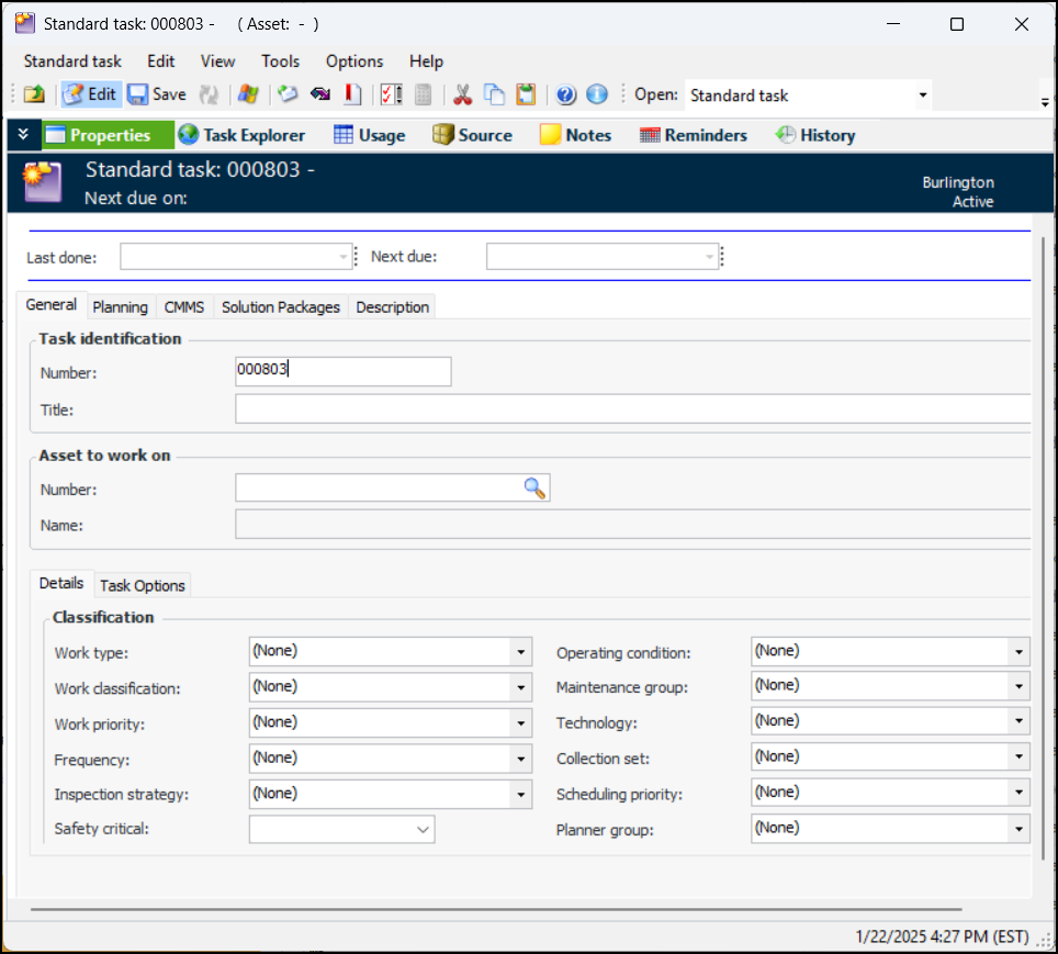 2. Click New. The Standard Task window appears:Tip:To have the Last done and Next due information displayed at the top of Standard Task and Indicator windows, see Enabling Next Due Date Information.