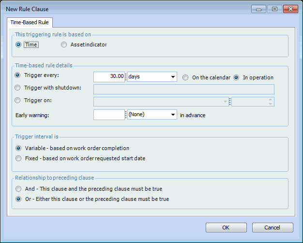 • To trigger on a regular time interval, select Trigger every and enter the appropriate interval. For example, select to trigger every 30 days. Select whether the triggering will be based on calendar or in-operation days. You can enter an early warning time for the rule in the Early warning box. For example, you could have an early warning five days in advance of the actual trigger.