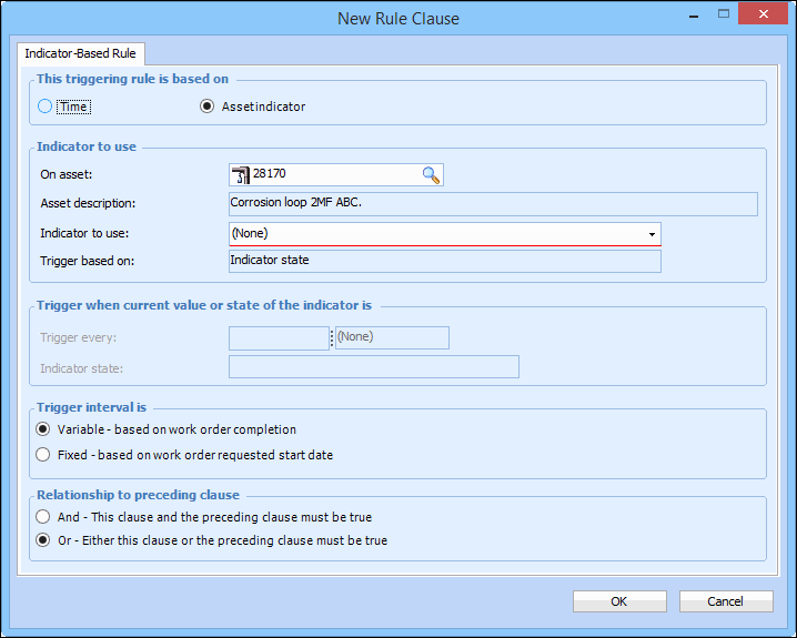 This topic explains how to create an indicator-based rule clause. To create a rule clause that uses time-based triggers, see Creating a Time-based Rule Clause.To Create an Indicator-based Rule Clause
