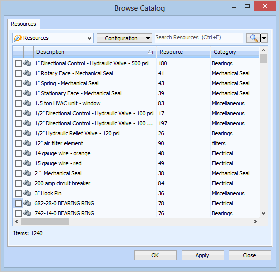 5. Select the Resources tab. To add resources to the RFQ, click the New list and select Browse. The Browse Catalog dialog appears.Tip: You can filter the list of resources shown in the dialog using the Search bar. To see only items that begin with a letter or number use the buttons in the Starts with section. To see the whole list again, click the Clear button.