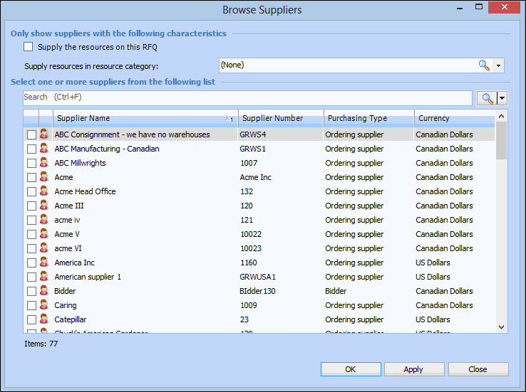 12. Select the check boxes beside each supplier that you want to add and then click OK. The suppliers are added to the list.