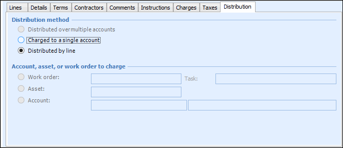 9. Choose Distributed by line. Selecting the account to charge for each line separately enables you to add single lines to blanket releases. Each line contains its own charging information.