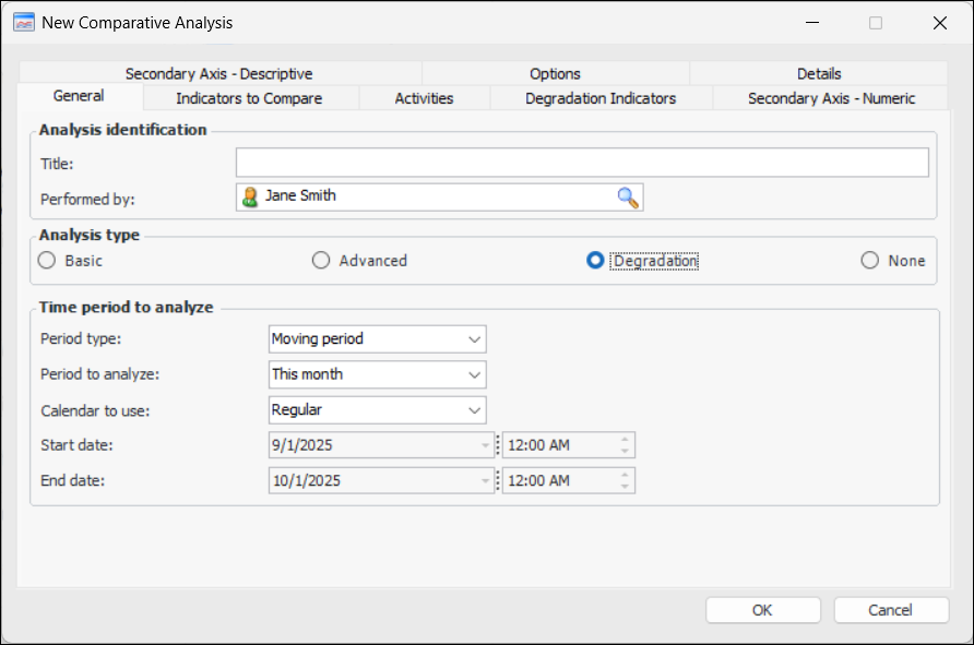 10. Select the Degradation Indicators tab. This tab lists the indicators whose readings appear in the Analysis view and tab. When you add indicators using the New Comparative Analysis dialog, they are automatically added to this tab in the same order. For example:You can remove indicators or change their order. To include additional indicators, first add them on the Indicators to Compare tab.