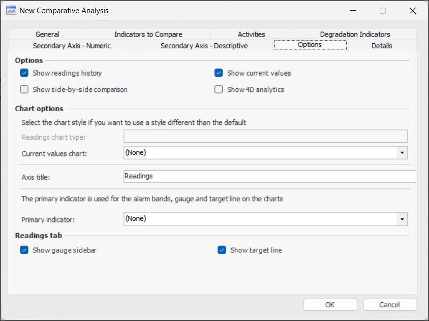By default, a gauge sidebar is displayed in the Analysis view, Indicators tab, Readings tab. You can turn this feature off by clearing the selection.
