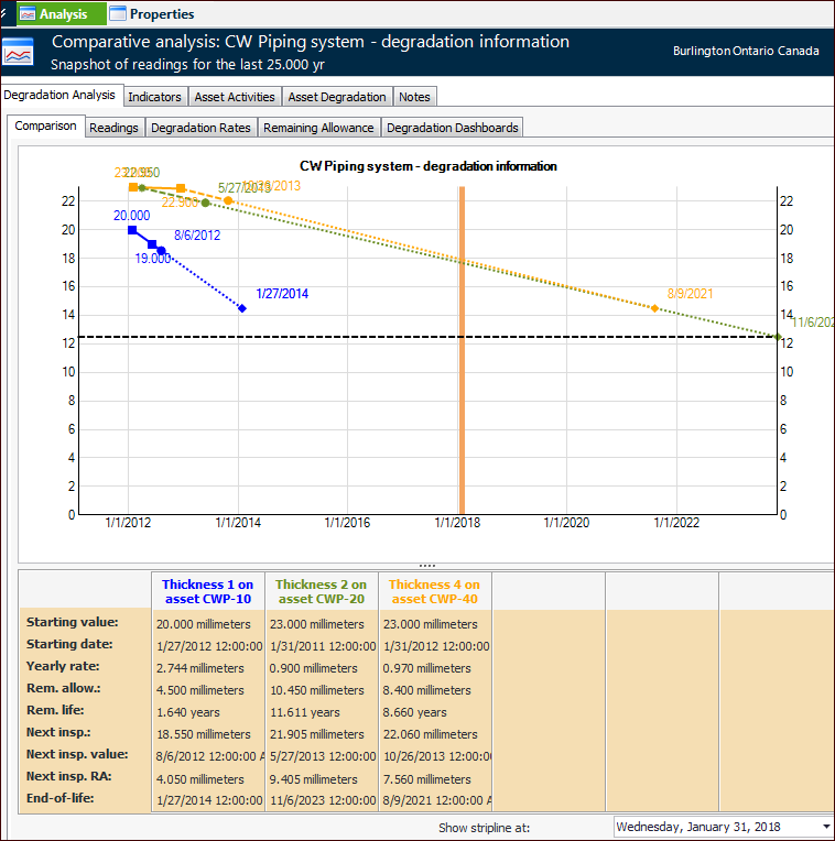 14. Select the Analysis view, Degradation Analysis tab to see charts of the comparative analysis. This tab includes the Readings, Degradation Rates, Remaining Allowance, and Degradation Dashboards tabs. For example: